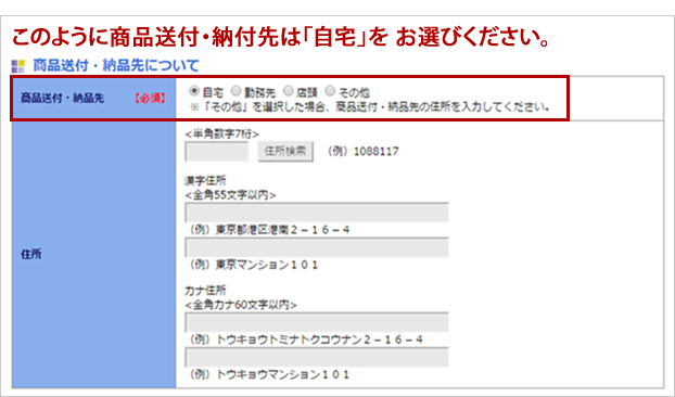 <セディナ分割払いをご利用の場合、製品の受け取りは「自宅」のみになります。>お客様が申込入力の際には必ず「自宅」をお選びください。